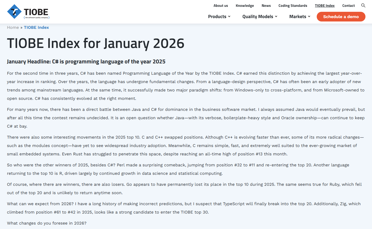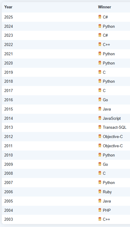 - 2025年度语言:C#。 C#是三年里第二次获此称号,排名年度涨幅最大;它跟进新趋势,完成了跨平台、开源的转型,和Java在商业软件领域的竞争仍未分胜负。