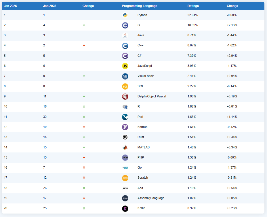 - C和C互换了前十排名,C因适配嵌入式市场保持优势,C的新特性(如模块)普及度不足;