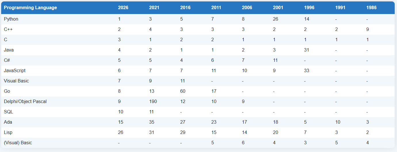 - 2026预测:TypeScript有望进前20,Zig可能进入前30。